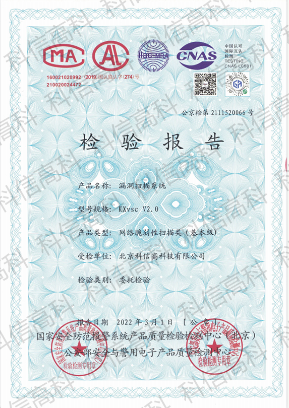 检验结论:公安部安全与警用电子产品质量检测中心经对北京科信高科技有限公司的2台KXvscV20型漏洞扫描系统进行委托检验,所检项目的检验结果符合GB/T20278-2013《信息安全技术网络脆弱性扫描产品安全技术要求》基本级和 TC/OP(XZ)5B-39-2018《通用安全性测试项目检测实施细则》的有关规定。