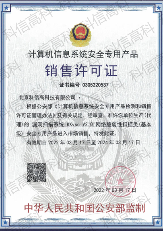 北京科信高科技有限公司于2022年1月向公安部一所送检了漏洞扫描系统KXvsc V2.0,并于2022年3月获得检测报告和销售许可证。