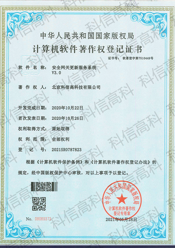 北京科信高科技有限公司2021年05月28日获得中华人民共和国国家版权局网络综合监控系统软著证书