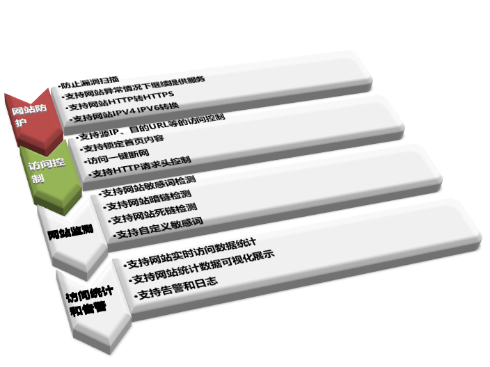 针对政府、教育、企业单位网站多且分散,无法进行有效管理、且缺少监控、预警、响应、访问控制等关于网站安全的管理问题,我们推出了WEB应用访问控制平台。WEB应用访问控制平台,能够提供网站访问控制,防漏扫,网站幻像内容保护,网站监测,网站锁定和一键断网,网站升级等功能的产品,可以对网站群资产进行有效管理。